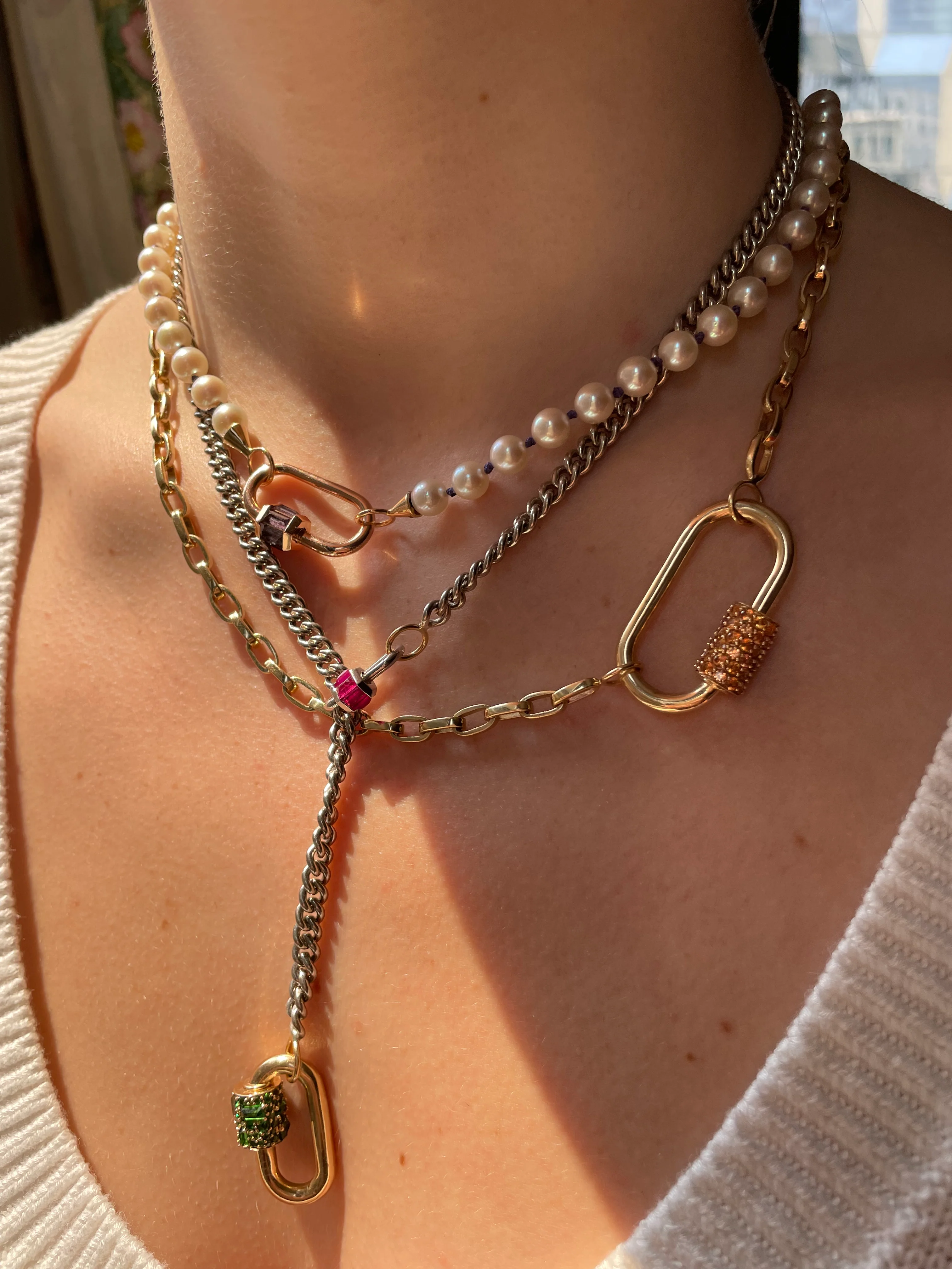 The Stoned Regular Lock measures 3cm x 1.5cm with a thickness of 4mm, the closure of 6mm. Fits best on all stone or pearl necklaces, and a variety of our thicker chains and bracelets.