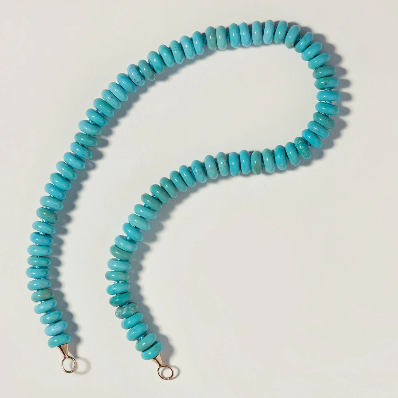 A strand of turquoise rondelles measuring approximately 10mm wide and up to 24" long. Rondelle refers to the round circular way in which the stones are cut. A perfect addition and interesting counterpoint to a chain for your lock.