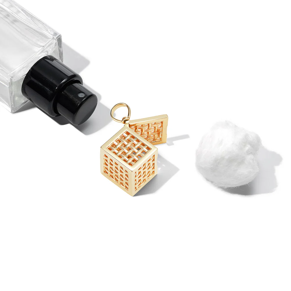 It means that the box is quite literally a vehicle for your fragrance. With six woven sides, this version gives the ultimate fragrance experience to carry with you as a charm. The first versions of a"vinaigrette" was a pomander, that can be traced back to the Middle Ages and were generally in gold or silver and studded with jewels, pierced to allow the fragrance to disperse. Vinaigrettes evolved from this idea during the late 18th century and were small containers used for holding various aromatic substances. They usually held a tiny piece of sponge soaked in a liquid (like vinegar). It's primary purpose was to mask bad smells. The primary purpose of our Vinaigrette is for your fragrance. Simply soak a cotton ball or a tissue in your favorite fragrance and nestle it in the box and that is all. I'm sure you can think of other things to put in there... of course you can.
